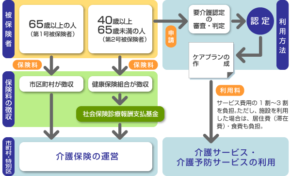 介護保険は市町村および特別区(東京23区)が運営を行い、国や都道府県も費用の負担や基盤整備など、様々な面でバックアップします。なお、健康保険組合も介護保険料の徴収を行い、介護保険の事業運営に協力しています。